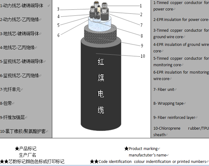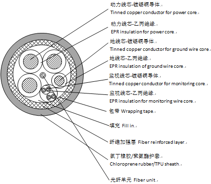 flame resistance, sun aging, wear resistance, tear resistance, salt spray resistance, cyclic bending (meet IEC80005.1 provisions of 5000 winding test) and excellent electrical performance (pressure test 3.5kV /5min). |