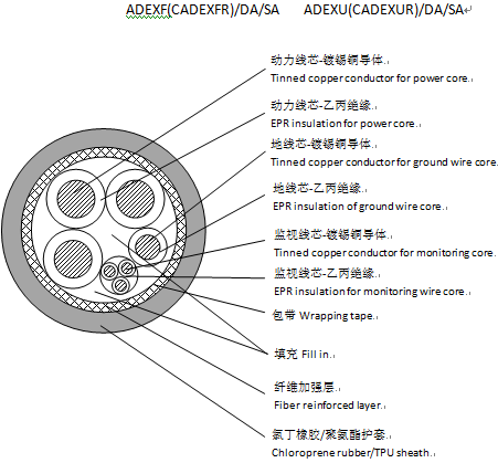 乙丙絕緣纖維編織加強層聚氨脂護套船岸連接電纜,DA/SA型 EPR insulated fiber braided reinforcement TPU sheathed Ship-to-Shore Connection Cable,Type DA/SA |