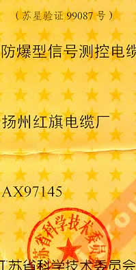江蘇省星火計(jì)劃項(xiàng)目驗(yàn)收合格證(防爆型信號(hào)測(cè)控電纜)